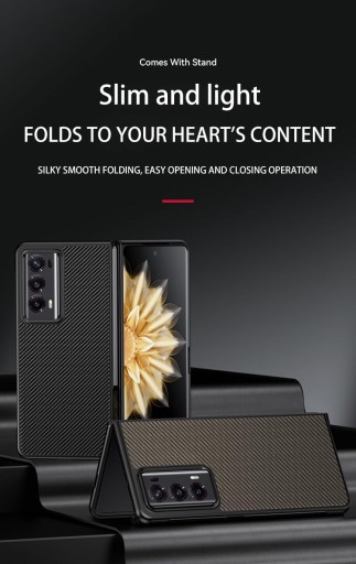 【Wygląd】: Górna i dolna część etui Honor Magic V2 jest wykonana z procesu grawerowania z włókna węglowego, w połączeniu z powierzchnią o ekskluzywnej szczotkowanej teksturze, która jest odporna na odciski palców i pot. Miękki materiał TPU zapewnia wygodną przyczepność, aby zapobiec ślizganiu się telefonu.