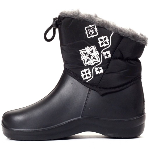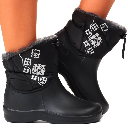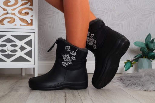 Damskie, zimowe śniegowce w kolorze czarnym. Posiadają ocieplenie. ⭐ Posiadają wodoodporną, solidną, grubą piankową podeszwę izolującą od zimna.