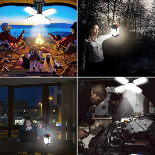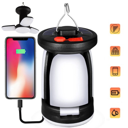 Dzięki jasności 1000 lumenów i czasowi pracy od 8 do 12 godzin, lampa jest bardzo wygodna podczas biwakowania. Dzięki akumulatorowi o pojemności 4500 mAh lampa kempingowa może być używana jako awaryjny power bank. Jednocześnie lampę można ładować za pomocą baterii słonecznej lub kabla USB. Trzy boczne lampki można złożyć o 90 stopni, dzięki czemu lampa kempingowa LED może służyć jako lampka do czytania.