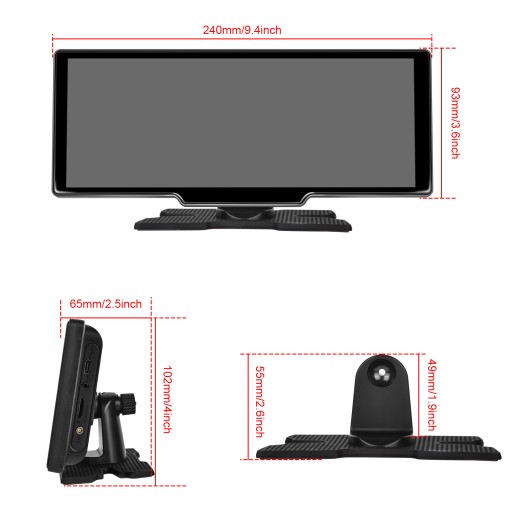 W zestawie dostajesz 10,26 calowy ekran do samochodu, który możesz postawić na kokpicie (przykleić za pomocą taśmy 3M lub nawet przykręcić). Ekran IPS LCD jest dotykowy z wysoką rozdzielczością (1600x600 px). Monitor ma też dobre parametry jeśli idzie o kąty widzenia (w poziomie to ok. 150 stopni), więc ten sprzęt może znaleźć swoje miejsce w większych autach typu busy, vany czy autokary. Szczególnie, że sam monitor możesz przenosić z auta do auta. Monitor ma opcję pochylenia ekranu.