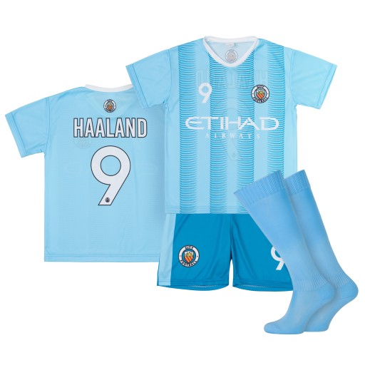 Posiadamy w sprzedaży nowe komplety strojów + getry z motywem HAALAND MACHESTER CITY 9 w rozmiarze 128cm.