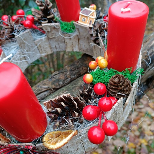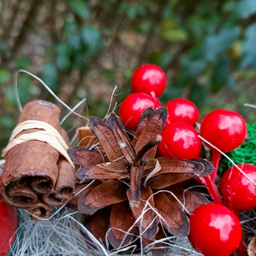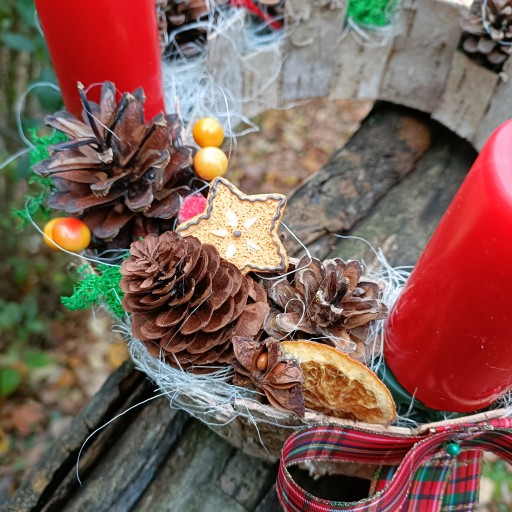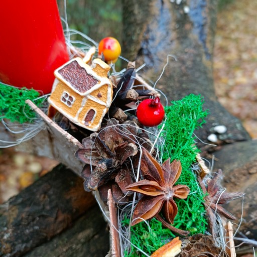 - OZDOBIONY CYNAMONEM, ANYŻEM ORAZ SUSZONYMI POMARAŃCZAMI, SZYSZKAMI, KWIATAMI LOTOSU, MCHEM CHROBOTEK RENIFEROWY, SZTUCZNYM GŁOGIEM I JARZĘBINĄ ORAZ DEKORACJAMI A'LA PIERNIK DOMEK I GWIAZDKA