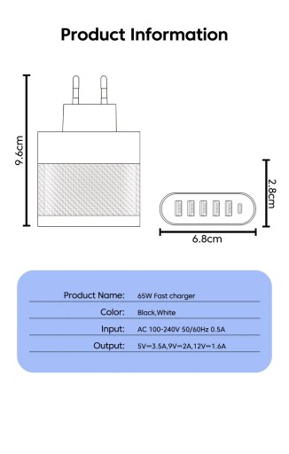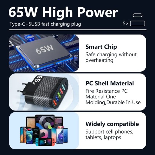 ZASILACZ ŁADOWARKA 230V 65W 6 PORTÓW USB USB-C SZYBKIE ŁADOWANIE QC 3.0 PD