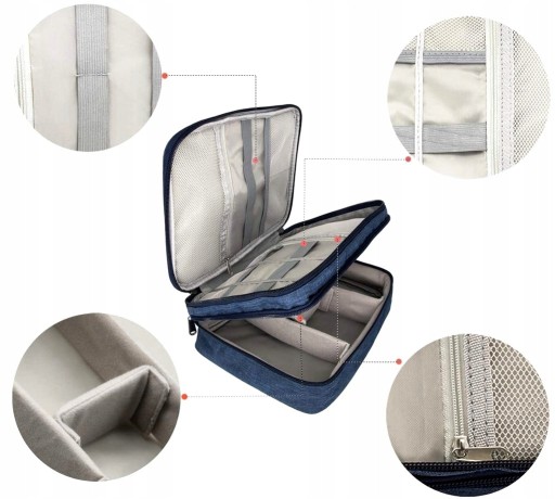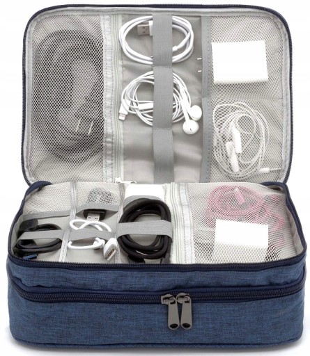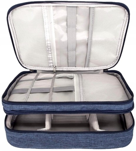 ?Organizer posiada konstrukcję dwuwarstwową, wewnątrz znajdują się różne kieszonki do organizacji akcesoriów, kabli
