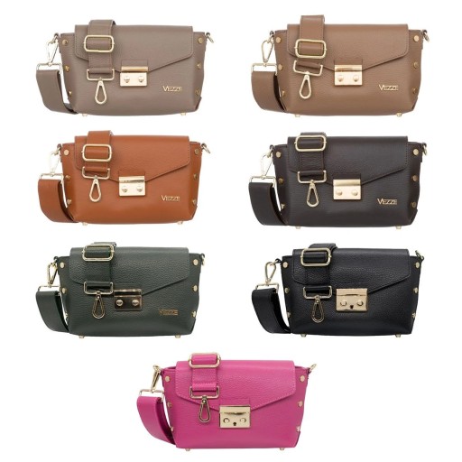 Zachwycająca torebka marki Vezze to synonim stylu i klasy. Jej wykonanie z najwyższej jakości skóry licowej zapewnia nie tylko trwałość, ale i niepowtarzalny urok. Dodatkowo, pięknie zdobione złotymi nitami, torebka zyskuje na wyjątkowym charakterze i eleganckim wykończeniu.