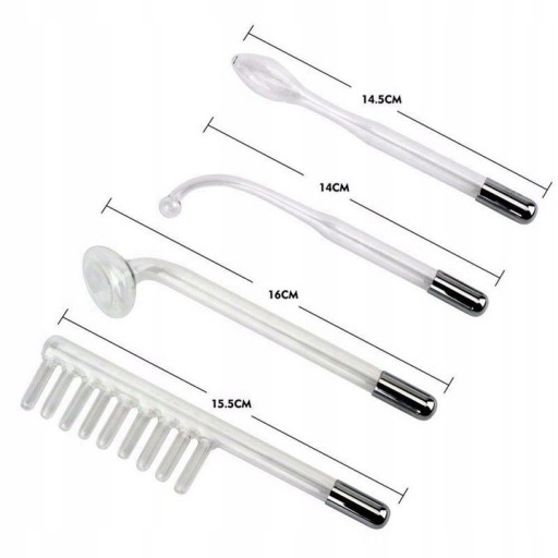 Urządzenie D'Arsonval oferowane na naszej aukcji posiada w zestawie 4 szklane peloty, do zastosowania na różnych powierzchniach ciała: