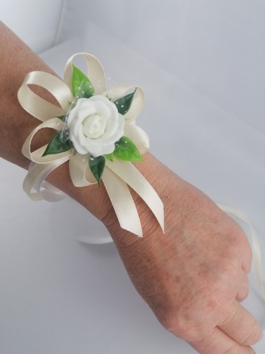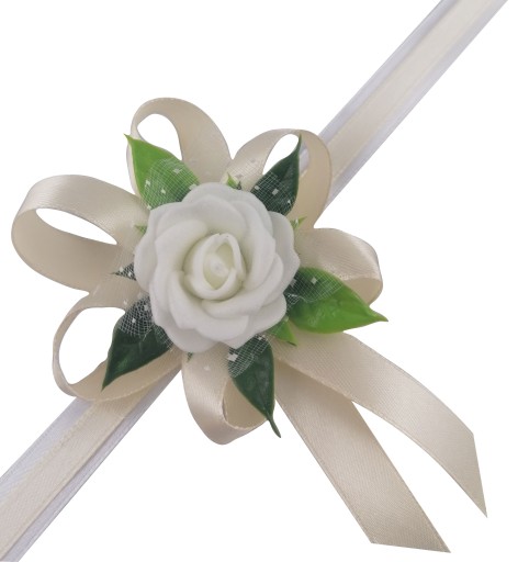 - kwiat w kolorze białym upięty na satynowych tasiemkach /12 i 6 mm /kremowej i białej/