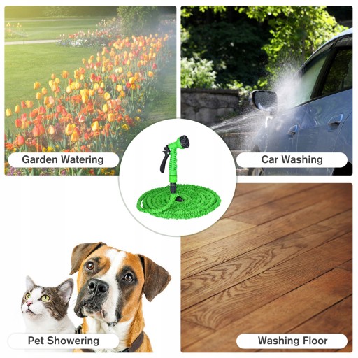 3-krotne wydłużenie: Kiedy woda przepływa przez wąż wodny, wąż można przedłużyć 3 razy; wąż cofnie się do poprzedniej długości bez wody, co jest wygodne w przypadku używania na duże odległości. (25 stóp: 2,5 m, około 7,5 m po przedłużeniu; 50 stóp: 5 m długości, około 15 m po przedłużeniu; 75 stóp: 7,5 m długości, około 22,5 m po przedłużeniu; 100 stóp: 10 m długości, około 30 m po przedłużeniu)