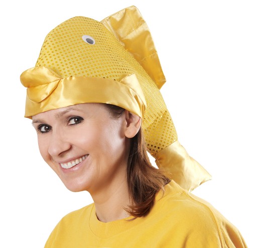 Czapka Złotej rybki, uszyta z miłego w dotyku materiału ozdobionego cekinami, dzięki czemu Rybka połyskuje. W czapkę wszyta jest gumka, dzięki czemu czapka pasuje zarówno na dzieci jak i osoby dorosłe.
