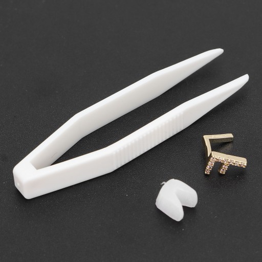 3. Włóż złote zęby (srebrne) do ust i delikatnie zagryź złote zęby górnymi i dolnymi zębami. Miękki utrwalony wosk jest ściskany przez zęby w celu dostosowania kształtu w jamie ustnej użytkownika, dopasowania się do kształtu zęba oraz spełniania roli utrwalania i kształtowania.
