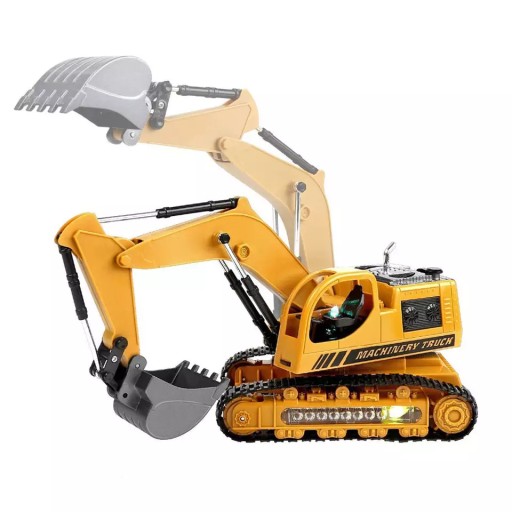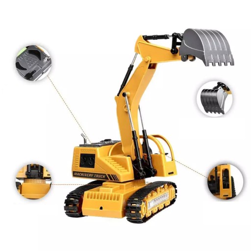 Koparka wzorowana na prawdziwej maszynie. Posiada ruchome ramię z łyżką, realistyczną kabinę z miejscem siedzącym dla operatora, wyposażona w gąsienice, które wjadą na trudniejszy teren. Wyposażona w kolorowe światła LED umieszczone w gąsienicach. Pilot sterowania wprawiający koparkę w ruch. Koparka jest zasilana akumulatorem, który ładujemy za pomocą kabla USD - który jest dołączony do zestawu.