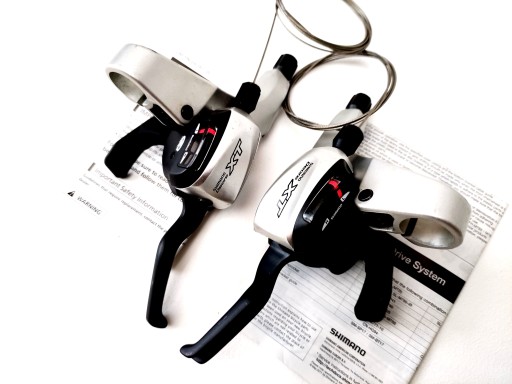 NOWE klamkomanetki SHIMANO DEORE Deore XT ST-M761 Dual Control lewa strona 3 biegi, prawa 9 biegów. Klamkomanetki kompatybilne z przerzutkami SHIMANO i SRAM oraz hamulcami tarczowymi mechanicznymi i V-BRAKE. Produkt w 100 % oryginalny. Posiadają ślady zbiorczego magazynowania w postaci rys i otarć.