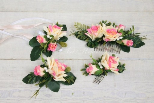 Można również dokupić do kompletu przypinkę do butonierki oraz mniejszy i większy grzebyk w takim samym stylu.