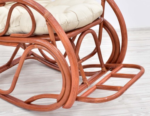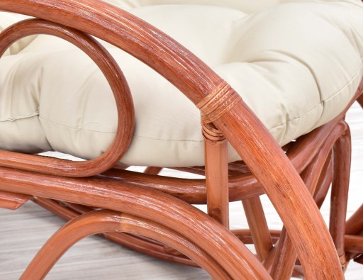 Fotel bujany wykonany z rattanu, lakierowany, wybarwiony w kolorze koniakowym. Mebel ręcznie wytworzony w manufakturze w Indonezji. Fotel wyposażony został w mocowaną na rzepy, ergonomiczną i wyjątkowo komfortową w użytkowaniu poduszkę pokrywającą całą powierzchnię siedziska i oparcia. Dodatkowo zastosowano wygodny podnóżek dla podniesienia komfortu korzystania z fotela. Unikatowa estetyka mebla i jego funkcjonalność zapewnią wiele godzin relaksu osobom z niego korzystającym.