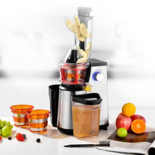 Urządzenie wyposażone jest w 2 wyloty: szerszy wylot do zbierania soku i drugi wylot do zbierania miąższu. W zestawie znajdują się 2 pojemniki, a także wyjmowanym filtrem ze stali nierdzewnej i tworzywa sztucznego, umożliwiającym jednoczesne zbieranie soku i miąższu w celu uzyskania jednorodnego, klarownego soku bez pozostałości.