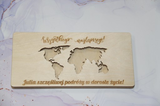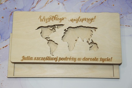 Prezentujemy nowoczesne rozwiązanie zamiast zwykłej, standardowej koperty mamy dla Ciebie propozycję pięknego, mega efektownego pudełka z wysuwanym miejscem na pieniądze. W elegancki sposób będziesz mógł przekazać pieniądze oraz złożyć życzenia solenizantowi. Nasze drewniane opakowanie jest wykonane z największą starannością i utrzymane w subtelnej naturalnej kolorystyce z grawerowanymi elementami przez co łączy w sobie elegancję i funkcjonalność.