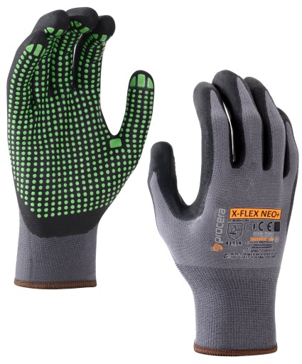 Rękawice X-FLEX NEO PLUS wykonane z dzianiny nylonowo poliestrowej z dodatkiem lycry, powlekane w części chwytnej spienionym nitrylem w kolorze czarnym oraz dodatkowym nakropieniem w kolorze zielonym.