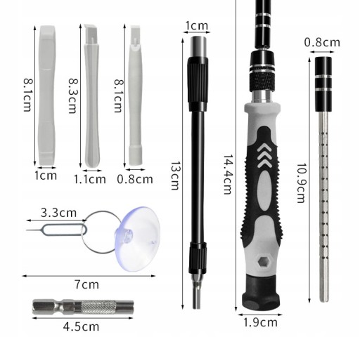 - uniwersalny komplet narzędzi, do użytku domowego oraz komercyjnego, przydatny do naprawy smartfonów, komputerów PC i innych