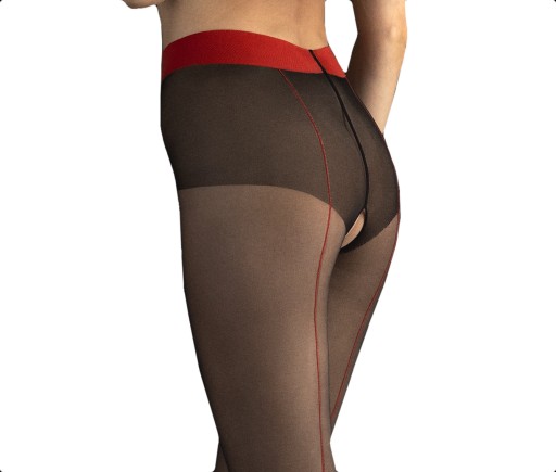 Efektowne rajstopy damskie z czerwonym szwem z tyłu, pikanterii dodaje rozcięcie w kroku. Brak wzmocnień na palcach. Grubość: 20 DEN. Skład: 90% poliamid, 10% elastan.