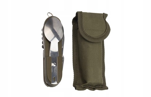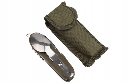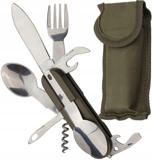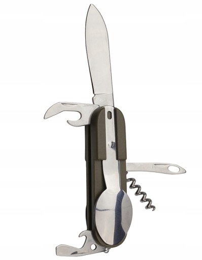 - Strumento da campeggio multifunzionale con 5 funzioni, come forchetta, cucchiaio, coltello, apribottiglie e apriscatole.