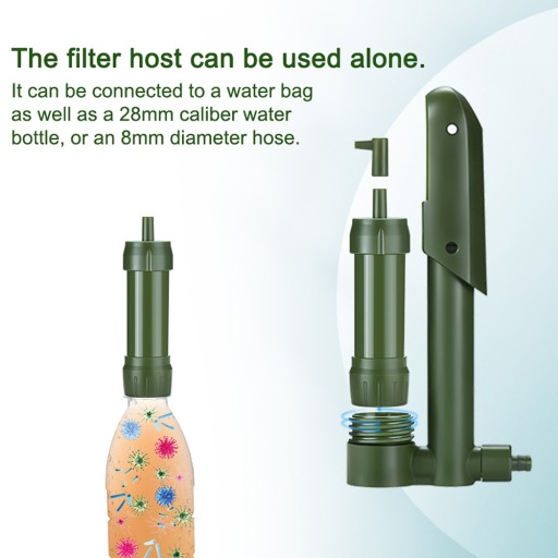 Hosta filtra można używać samodzielnie. Można go podłączyć do worka na wodę, jak również butelki na wodę kalibru 28 mm lub węża o średnicy 8 mm.