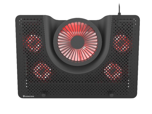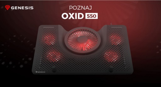 System chłodzenia Genesis Oxid 550 opiera się na czterech mniejszych wentylatorach wyprowadzających ciepłe powietrze spod laptopa i jednym dużym wentylatorze doprowadzającym chłodne powietrze. Wszystkie wentylatory posiadają czerwone podświetlenie LED, co dodaje podstawce ciekawego, gamingowego charakteru.