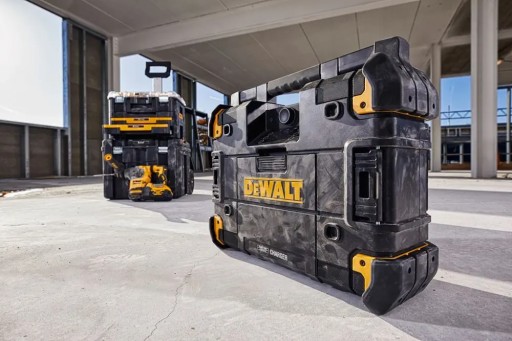 - Radio + ładowarka + TSTAK (kompatybilność z systemem skrzyń DeWALT)