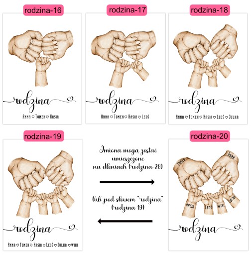 - Na dłoniach w plakacie „rodzina” od 16 do 20 imiona mogą znaleźć się zarówno na dłoniach jak i pod napisem „rodzina”, można również umieścić na nich np. daty urodzenia dzieci.