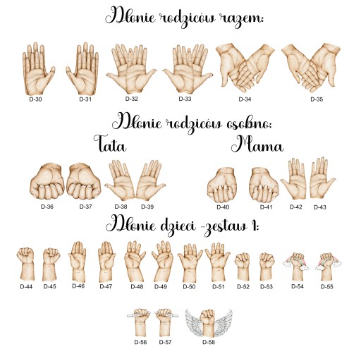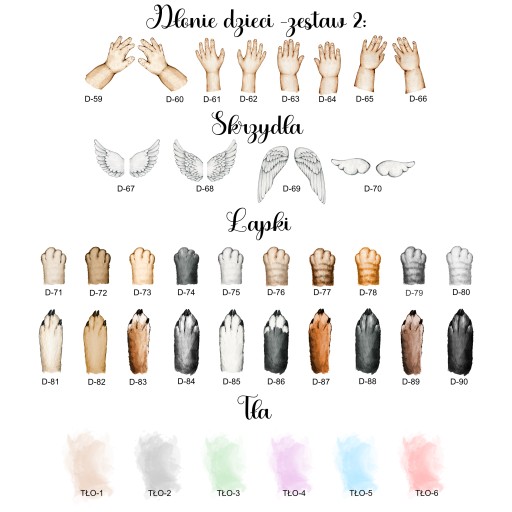 - Do każdej dłoni mogę dodać skrzydła aniołka – dostępne kilka rodzajów, rozmiar skrzydeł jest dostosowany do wielkości dłoni.