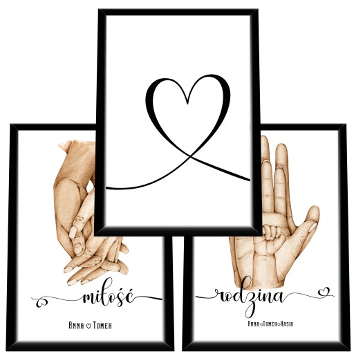 ZESTAW 3 SZT PERSONALIZOWANYCH PLAKATÓW A4 do pokoju w RAMKACH - Tryptyk - RODZINA DŁONIE MIŁOŚĆ