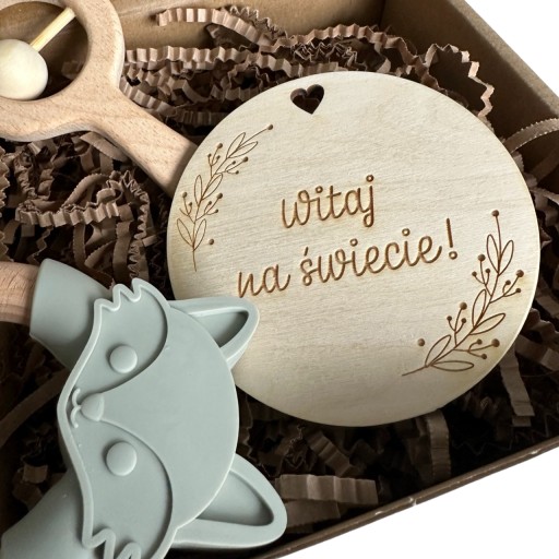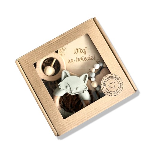 - kolor gryzaka - WYBOR - różowy, błękitny, jasnoszary ( w przypadku braku informacji wysyłamy zestaw ze zdjęcia poglądowego)