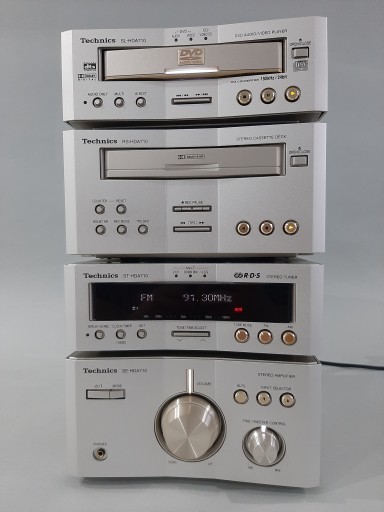 Elegancki i porządnie wykonany zestaw stereo produkcji Technics, w skład którego wchodzi: wzmacniacz, tuner radiowy, magnetofon, odtwarzacz CD/DVD oraz wszystkie konieczne, oryginalne taśmy łączące. Jeden z najwyższych modeli z tej serii urządzeń tego japońskiego producenta. Mimo niewielkich rozmiarów oferuje bardzo dobrej jakości dźwięk, świetnie się prezentuje i jest przyjemny w obsłudze.