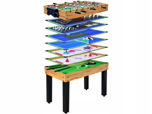 Wysokiej jakości duży stół do gier zapewniający masę rozrywki dla każdego gracza. Wyposażony został w demontowane blaty umożliwiając grę w aż 12 niepowtarzalnych rozgrywek. Oprócz podstawowych piłkarzyków , cymbergaja i bilarda znajdziemy tu również ping pong , kręgle, szachy, warcaby i wiele innych