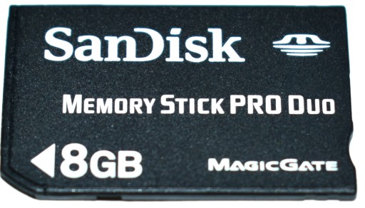 Karta pamięci o pojemności 8GB firmy SANDISK przeznaczona dla konsoli Sony PSP.