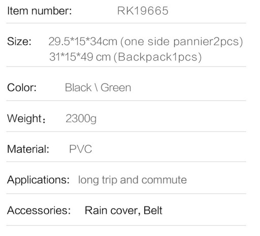Cały zestaw ma pojemność 75l! Zestaw obejmuje 3 sakwy oraz pokrowiec wodoodporny. Wymiary podane są na zdjęciu obok: