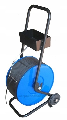 Prosty i funkcjonalny, bardzo przydatny podczas pakowania wyposażony w system jezdny - ułatwia rozwijanie taśmy oraz dzięki pojemnikowi na akcesoria łatwe i szybkie jednoczesne przenoszenie zarówno taśmy jak i akcesoriów przydatnych przy spinaniu. Talerze zabezpieczają taśmę przed samoczynnym rozwijaniem ze szpuli