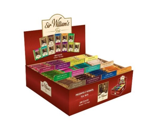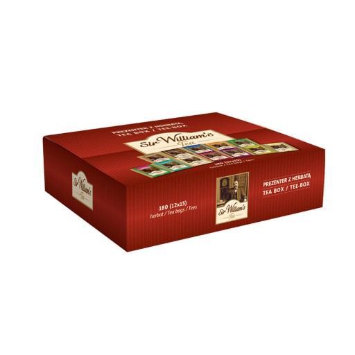 Czerwone pudełko z herbatami Sir William's 180 jest znakomitym i atrakcyjnym prezentem dla bliskiej osoby, która lubi różne smaki herbaty. Zestaw wspaniale sprawdzi się na świąteczny prezent. Można go też sprezentować na Walentynki, Dzień Matki, Dzień Kobiet, Dzień Babci, dla nauczyciela. Herbata Sir William's w dużym opakowaniu nadaje się również na prezent dla partnera biznesowego czy pracownika.