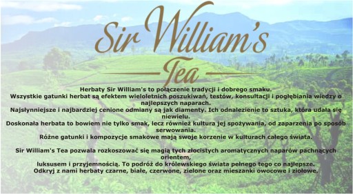 Sir William's Tea to marka dobrej klasy produktów gastronomicznych. Wszystkie saszetki są dwukomorowe, z zawieszkami, pakowane w całkowicie szczelne aluminiowe koperty, powlekane papierem. Doskonale zachowują świeżość po otwarciu zbiorczego opakowania (kartonu).