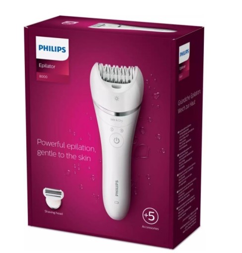 Dokładna depilacja delikatna dla skóry Depilator Philips z serii 8000 zapewnia dokładną, a jednocześnie delikatną depilację, dzięki czemu pozwala uzyskać gładkość dolnych partii obu nóg w zaledwie 10 minut. Ciesz się korzyściami wykraczającymi poza samą depilację dzięki dodatkowym akcesoriom