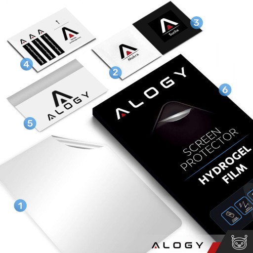 - W zestawie: 1x Folia hydrożelowa Alogy, 1x mokra ściereczka, 1x sucha ściereczka, 1x Zestaw naklejek pozycjonujących i naklejka odpylająca, 1x Rakla