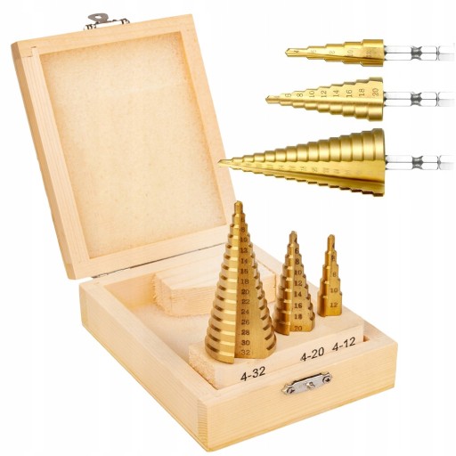 СВЕРЛА СТУПЕНЧАТЫЕ КОНИЧЕСКИЕ СВЕРЛА НАБОР 3 шт. TYTAN HSS 4-32 ДЕРЕВЯННЫЙ КОРПУС