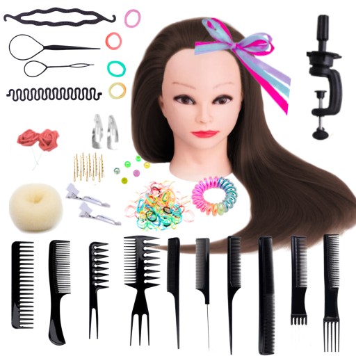 Zestaw zawierający głowę fryzjerską z włosiem syntetycznym w kolorze brązu oraz wiele przydatnych akcesoriów do nauki. Główka jest idealna do nauki dla osób początkujących jak i tych, które chcą trenować i ulepszać swoje umiejętności. Włosy są miękkie i gładkie, doskonałe do tworzenia ulubionych upięć, a akcesoria pozwolą na piękne przyozdobienie fryzury! Każda główka posiada w zestawie uchwyt dzięki, któremu z łatwością zamocujesz ją do blatu pod odpowiednim kątem.