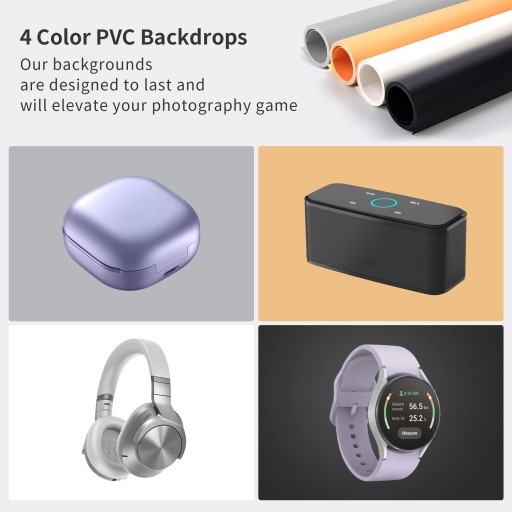 Opakowanie zawiera 4 kolory miękkiej tablicy z tłem z PVC (czarny/biały/szary/pomarańczowy). Używamy odpowiedniego materiału do zniszczenia i trwalszego materiału PVC, który jest o 30% trwalszy niż papier tła innych producentów. Kolory są jednolite, a zastosowane wyłącznie na tle. Różnorodność kolorów zapewnia dostęp do różnych fotografii, ułatwiając robienie zdjęć z teksturą