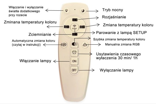 - W lampie znajduje się źródło światła w trzech barwach światła do wyboru za pomocą pilota, można ustawić kolor ciepły biały, neutralny biały oraz zimny biały w zależności od potrzeb i pory dnia.