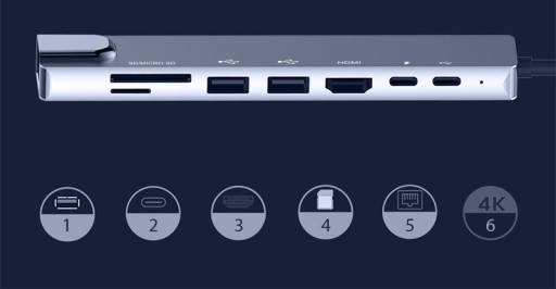 ADAPTER HUB 8w1 USB-C HDMI RJ45 ETHERNET KARTA PAMIĘCI SD KARTA SIECIOWA