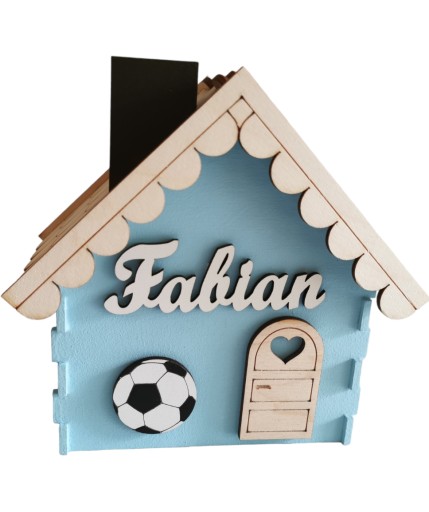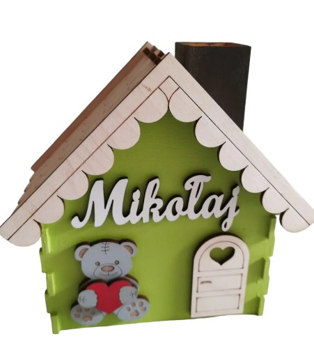 Pieniądze wpadają przez komin. Od spodu domku zamknięcie.
