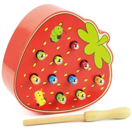 Ta wyjątkowa gra drewniana to doskonały pomysł na zajęcie malucha. Zabawa polega na chwytaniu drewnianym kijkiem zakończonym magnesem robaczków ukrytych w otworkach znajdujących się w owocu a następnie na ich ponownym wkładaniu. Jest to spore wyzwanie dla malucha, które wymaga skupienia uwagi oraz sprawności manualnej.