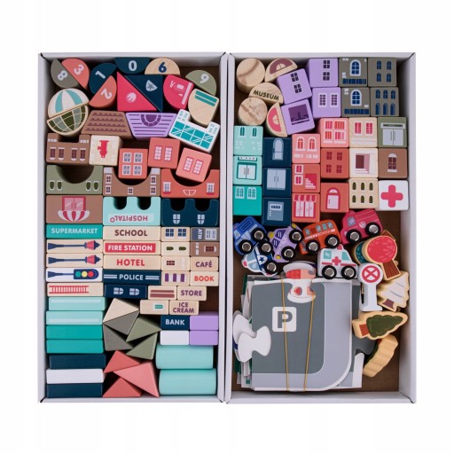 Zabawka, jaką są klocki drewniane miasto, to wiele godzin niesamowitej zabawy dla najmłodszych. Zestaw jest bardzo duży – w jego skład wchodzi aż 115 różnego rodzaju klocków i 20 szt. puzzli imitujących ulicę. Z klocków można układać różnego rodzaju budynki mieszkalne oraz budynki użyteczności publicznej, ponadto zestaw obejmuje również elementy takie jak drewniane pojazdy, budynki, drzewka. Wszystkie elementy malowane są bezpiecznymi dla dzieci oraz przyjaznymi dla środowiska farbami. Brak ostrych krawędzi, przyjemna w dotyku struktura drewna i różne kolorowe kształty. Dziecko może stworzyć z nich dowolne budowle oraz całe miasteczko, co może pozytywnie wpłynąć na rozwój kreatywności i wyobraźni.