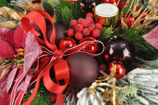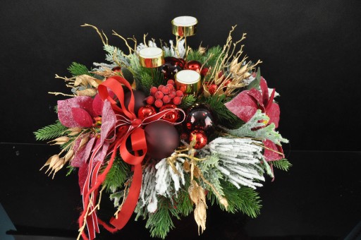 Dekoracja umieszczona w flower box czerwonym aksamitnym okrągłym.