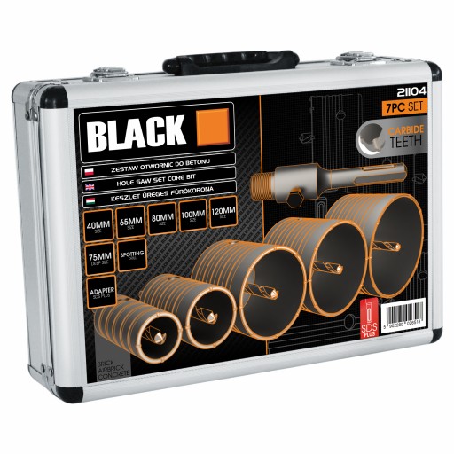 ZESTAW PROFESJONALNYCH OTWORNIC DO MURU/BETONU MOCOWANIE SDS+ 21104 BLACK 40mm, 65mm, 80mm, 100mm, 120mm